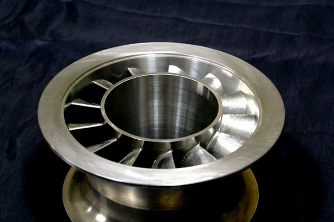 13枚のステータベーンを削り出した小型ジェットエンジンのタービンノズルです。タービンブレードとタービンケースをニッケル蝋で蝋付し一体化させます。