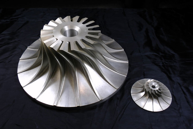 ブレード18枚を削り出した直径250MMのタービンホイールと、ブレード13枚を削り出した直径82MMのタービンホイールです。