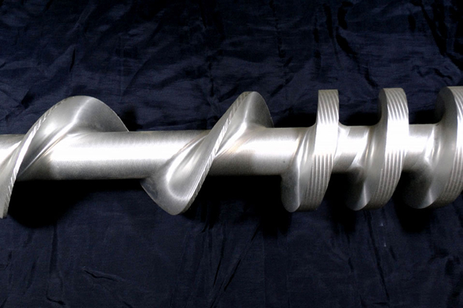 SUS304食品機械に使用される不等リードスクリューロータの削り出しです。 左側の等リード部分にスプーン型の歯を配置し、右側の等リード部分に台形型の歯を配置し、中央不等リード部分は歯型断面が滑らかに変化します。スプーン型の歯は材料ブロックを強力にカットしながらフィールドする目的があり、台形型の歯は強力なプレッシャーを与えます。中心軸径も右側に行くに従って徐々に太くして、より強力なフィールドプレッシャーを与えることは可能です。歯型断面形状並びに形状の変化、リードの変化等も要望にお応え致します。
